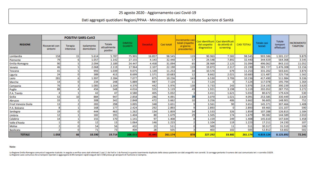 ROMA (ITALPRESS) – Sono 878 i nuovi casi positivi di Coronavirus in Italia nelle ultime 24 ore, che portano ad un totale di 19.714 persone attualmente contagiate. E’ quanto emerge dal quotidiano Bollettino del Ministero della Salute e della Protezione Civile. I casi totali registrati da inizio pandemia passano quindi a 261.174. Il numero di decessi nelle ultime 24 ore sale di 4, arrivando ad un totale di 35.445. Le persone attualmente ricoverate con sintomi sono 1.058 (solo 13 in più di ieri), dei quali 66 sono in terapia intensiva (uno in più di ieri) e 18.590 in isolamento domiciliare. I tamponi effettuati nelle ultime 24 ore sono 72.341, per un totale di 8.125.892. Il Molise è l’unica regione che nelle ultime 24 ore non ha registrato nemmeno un positivo, mentre la regione che fa registrare il maggior numero di nuovi casi è il Lazio con 143, seguito dalla Campania con 138.