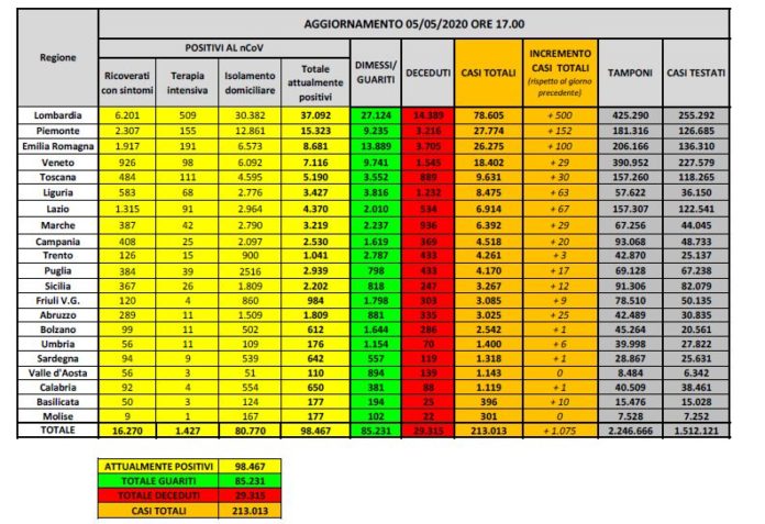 A oggi il totale delle persone che hanno contratto il virus è 213.013, con un incremento rispetto a ieri di 1.075 nuovi casi. Il numero totale di attualmente positivi è di 98.467, con una decrescita di 1.513 assistiti rispetto a ieri. Lo rende noto la Protezione Civile.