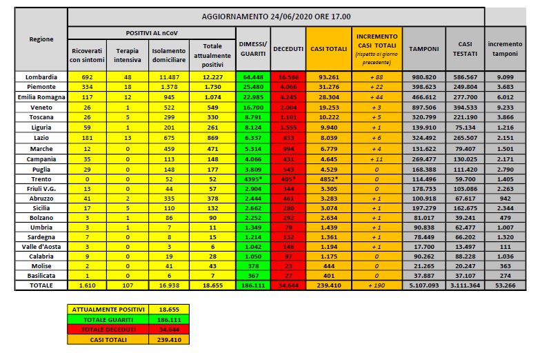 Al 24 giugno, il totale delle persone che hanno contratto il coronavirus che causa il Covid-19 è di 239.410, con un incremento rispetto a ieri di 190 nuovi casi. Lo rende noto la Protezione Civile.