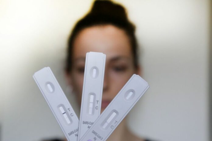 Una ragazza mostra una serie di tamponi antigenici rapidi fatti per diagnosticare il covid. Nella foto a sx si vede un test positivo, di seguito uno blandamente positivo ed infine a dx un test negativo (Modena - 2022-07-07, Roberto Brancolini) p.s. la foto e' utilizzabile nel rispetto del contesto in cui e' stata scattata, e senza intento diffamatorio del decoro delle persone rappresentate
