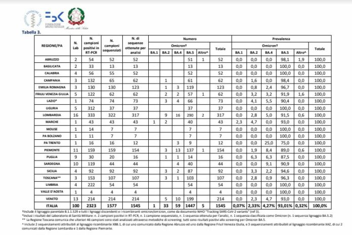 Queste le prevalenze stimate BA.1 0,1% (range: 0% -2,3%) BA.2 2,3% (range: 0% -6,3%) BA 4 4,3% (range: 0% -25,0%) BA 5 93,0% (range: 75,0% – 100,0%) Altro 0,3% (range 0%-1,9%).