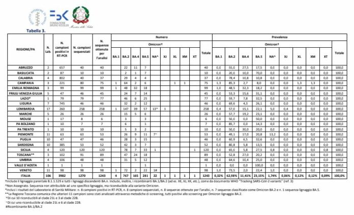 Queste le prevalenze stimate: 100% variante omicron di cui BA.1 0,32% (range: 0% -1,3%) BA.2 62,98% (range: 0% -85,7%) BA 4 11,41% (range: 0% -32,3%) BA 5 23,15% (range: 8% – 100%).
