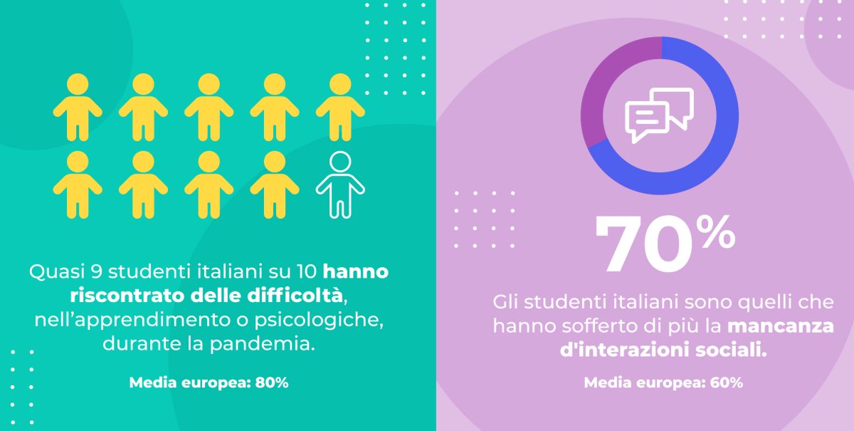 Quasi 9 ragazzi italiani su 10 (88%) hanno riscontrato delle difficoltà durante l’ultimo anno scolastico. Un dato più alto rispetto alla media europea che si attesta sull’80%. Inoltre, l’Italia si è aggiudicata anche un altro primato: gli studenti italiani (70%) hanno, infatti, sofferto maggiormente la mancanza di interazioni sociali rispetto ai coetanei degli altri Paesi (60%).