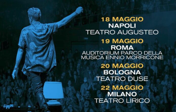 I live partiranno il 18 maggio dal Teatro Augusteo di Napoli, per proseguire il 19 maggio a Roma all’Auditorium Parco della Musica Ennio Morricone, il 20 maggio a Bologna al Teatro Duse, il 22 maggio a Milano al Teatro Lirico.