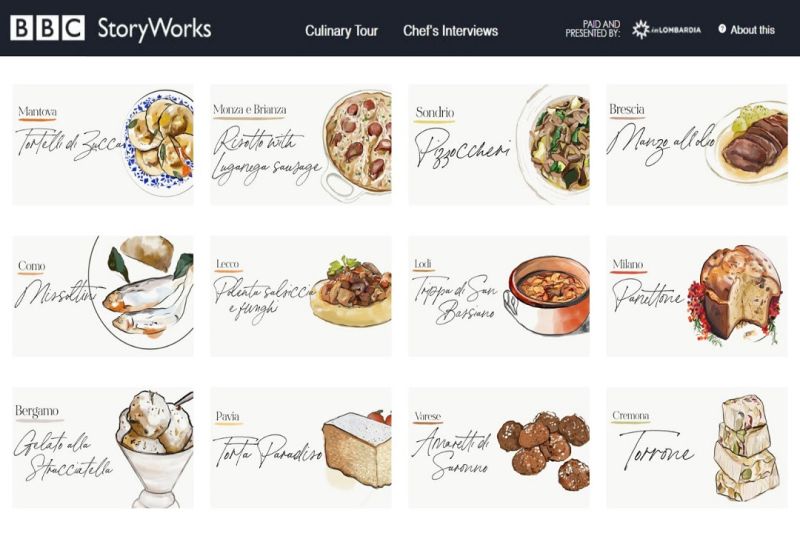 Sarà possibile scoprirlo sul sito ufficiale (http://www.bbc.com/storyworks/masters-of-lombardy/home-dish-cards) attraverso uno storytelling culinario con i principali piatti della tradizione regionale, uno per territorio: dal gelato alla stracciatella di Bergamo al manzo all’olio bresciano; dai missoltini di Como al torrone di Cremona e alla polenta salsiccia e funghi di Lecco.