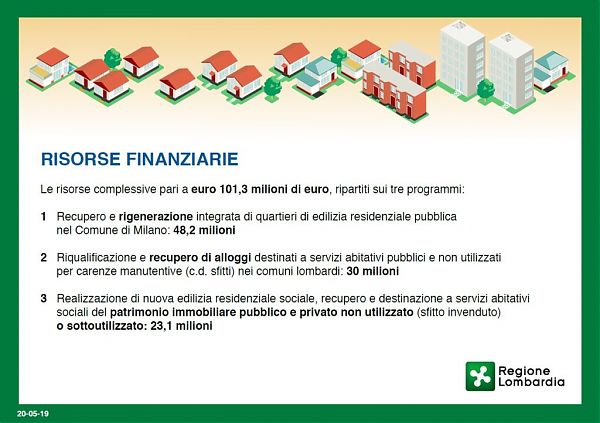 Il provvedimento si basa su 3 linee: 48,2 milioni di euro: per il recupero e la rigenerazione integrata dei quartieri di servizi abitativi pubblici nel Comune di Milano; 30 milioni di euro: per la riqualificazione e il recupero di appartamenti destinati a servizi abitativi pubblici e non utilizzati per carenze manutentive (i cosiddetti alloggi sfitti) nei Comuni lombardi, ad esclusione del Comune di Milano; 23,1 milioni di euro: per la realizzazione di nuova edilizia residenziale sociale, il recupero e la destinazione a servizi abitativi sociali del patrimonio immobiliare pubblico e privato non utilizzato (sfitto invenduto) o sottoutilizzato.