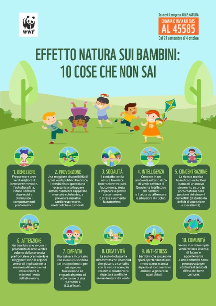 Raccogliendo le evidenze scientifiche e pedagogiche più recenti il WWF ha stilato i 10 fattori che vengono migliorati o sviluppati dal contatto con la natura: nel loro complesso hanno un effetto positivo che va ben di là della semplice ‘boccata d’arià. Secondo l’Attention Restoration Theory, gli ambienti urbani, al contrario, richiedono quella che viene chiamata attenzione diretta, che ci costringe a ignorare le distrazioni ed esaurisce il nostro cervello. Negli ambienti naturali, pratichiamo un tipo di attenzione senza sforzo noto come fascino morbido che crea sensazioni di piacere, non di fatica. Il mondo naturale è complesso, molto di più di qualsiasi ambiente costruito dall’uomo, ed evolve nel tempo. Lincisività delle esperienze dirette non riguardano mai solo la sfera cognitiva, ma coinvolgono tutto l’individuo nella sua fisicità e affettività.