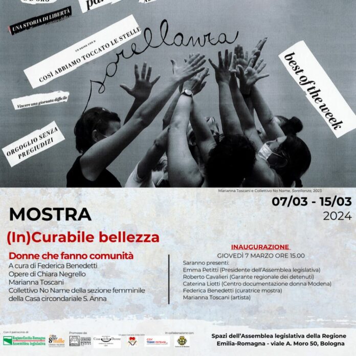 BOLOGNA (ITALPRESS) – Il 7 marzo alle ore 15 nella sede dell’Assemblea legislativa dell’Emilia-Romagna la presidente dell’Assemblea legislativa Emma Petitti, il garante dei detenuti della regione Emilia-Romagna Roberto Cavalieri e Caterina Liotti, Centro Documentazione donna di Modena, con le artiste e la curatrice che l’hanno realizzata, inaugurano “(In)curabile bellezza. Donne che fanno comunità” racconta attraverso fotografie e collages dell’esperienza del laboratorio di educazione all’arte che ha fatto incontrare la comunità, forte e coesa, delle pescatrici del Delta del Po con un gruppo di detenute e di volontarie delle associazioni modenesi Centro documentazione donna, Casa delle donne contro la violenza e Carcere-Città. Quell’esperienza è diventata la mostra d’arte “(In)curabile bellezza. Donne che fanno comunità”, curata da Federica Benedetti con opere di Chiara Negrello, Marianna Toscani e del Collettivo No Name della sezione femminile del Carcere Sant’Anna di Modena. Un incontro che parte dal coraggio e dalla determinazione di donne detenute, volontarie e operatrici che – pur nell’anonimato del modo in cui hanno scelto di definirsi, “Collettivo No Name” – si sono messe in gioco facendo nascere una comunità basata sui valori della sorellanza e della cura come emerge nei loro collages (su fotografie di Marianna Toscani). Una narrazione nuova che racconta qualcosa di apparentemente inconciliabile con la durezza del luogo in cui tutto ciò è avvenuto: la nascita di uno spazio di inaspettata bellezza. Una storia che è diventata anche “Collettivo No Name”, pubblicazione curata da Caterina Liotti, edito da Mucchi (XXI pubblicazione della Collana Storie Differenti del Centro documentazione donna), e che fa da catalogo alla mostra “(In)Curabile bellezza. Donne che fanno comunità”. Il volume raccoglie testi che Anna Perna, Paola Cigarini e Caterina Liotti hanno scritto sui temi della sorellanza, dei bisogni disattesi e della spersonalizzazione. Significativi poi i contributi di contestualizzazione dell’operazione realizzata, forniti da Grazia Zuffa, autrice di ricerche nazionali sul tema, che inquadra nel contesto italiano le problematiche legate alla detenzione femminile, e da Claudia Lòffelholz, Direttrice della Scuola di alta formazione Fondazione Modena Arti Visive, che indaga su come il linguaggio dell’arte possa aiutare a costruire una società più inclusiva, empatica e solidale. La mostra sarà visitabile fino al 15 marzo dal lunedì al venerdì dalle ore 9.30-18 nella sede dell’Assemblea legislativa delll’Emilia-Romagna in Viale Aldo Moro 50 a Bologna.(ITALPRESS).