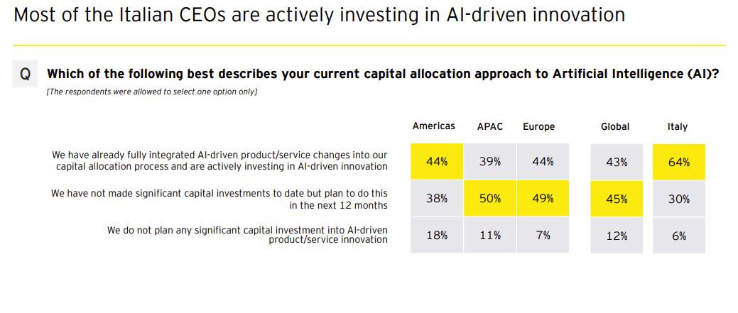 ‘Nonostante l’attuale contesto macroeconomico e geopolitico ponga ancora una volta le aziende di fronte a una molteplicità di rischi esterni e interconnessi, i CEO – e in particolar modo quelli italiani – stanno reagendo con ottimismo, con il 46% (contro il 31% a livello globale) deciso a trasformare i modelli operativi e di business – – commenta Massimo Antonelli, CEO di EY in Italia e COO di EY Europe West -. In questa trasformazione risulta chiaro il ruolo decisivo attribuito all’intelligenza artificiale, in relazione alla quale si dimostrano più avanti nel riconoscerne le opportunità rispetto ai colleghi di altri Paesi. Lungimiranti anche per quanto riguarda la sostenibilità: il 64% dei CEO italiani, in percentuale quasi doppia rispetto ai CEO a livello globale, investe risorse sostanziali per garantire valore di lungo termine ad azionisti e aziendè.