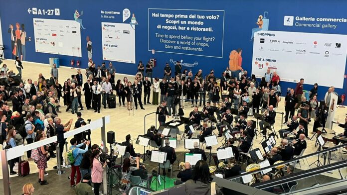 “In questi anni le note della Fanfara sono risuonate negli splendidi scenari delle piazze e dei teatri di tantissime città italiane e quest’oggi in un aeroporto internazionale che si è fatto testimone della promozione e la diffusione dei valori che la Fanfara vuole rappresentare, ovvero la legalità attraverso la cultura musicale”, si legge in una nota della Polizia di Stato.