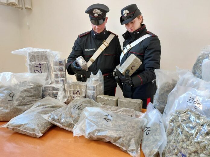 FIUMICINO (ROMA) (ITALPRESS) – I Carabinieri delle Compagnie di Roma Ostia e Roma Cassia, unitamente a quelli del Nucleo Investigativo del Gruppo di Ostia, hanno arrestato un cittadino italiano di 19 anni, incensurato, gravemente indiziato del reato di detenzione ai fini di spaccio di sostanze stupefacenti. Nella circostanza, nell’ambito dei consueti e quotidiani servizi di controllo del territorio volti a prevenire e reprimere i reati in genere, i Carabinieri hanno notato il 19enne uscire dalla propria abitazione di via del Monti dell’Ara e avvicinarsi a un’autovettura in sosta a margine della carreggiata, con a bordo due persone che, alla vista dei Carabinieri, si è data alla fuga, mentre il giovane si è diretto velocemente verso casa. Ragion per cui, insospettiti da tale atteggiamento, i Carabinieri hanno voluto vederci chiaro, raggiunto e bloccato il giovane e lo hanno sottoposto ad un controllo, trovandolo in possesso di due involucri contenenti 20 g di cocaina e circa 59 g di hashish. La successiva perquisizione domiciliare ha permesso ai Carabinieri di rinvenire e sequestrare ulteriori 29 kg circa di hashish, quasi 11 kg di marijuana, 38 g di cocaina e tutto il materiale per il confezionamento e l’imballaggio dello stupefacente, nonchè 485 euro in contanti, ritenuti provento della pregressa attività illecita. Per questo motivo, il 19enne è stato arrestato e sottoposto agli arresti domiciliari a disposizione dell’Autorità Giudiziaria.(ITALPRESS).