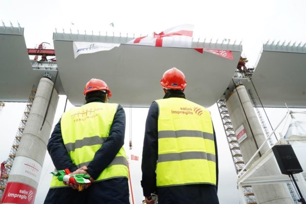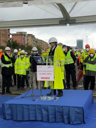 Oggi Genova ha di nuovo il suo ponte. A salutare il varo in quota dell’ultima campata in acciaio anche il Presidente del Consiglio Giuseppe Conte, il Ministro delle infrastrutture e dei trasporti Paola De Micheli, il Governatore della Regione Liguria Giovanni Toti e il Sindaco della città di Genova e Commissario per la ricostruzione Marco Bucci. Con quest’ultimo sollevamento, il viadotto sul Polcevera, disegnato da Renzo Piano, raggiunge i 1067 metri, la lunghezza dell’intera struttura che si staglia sobrio come la carena di una nave sullo skyline della città. La costruzione e progettazione è stata affidata a Fincantieri e Salini Impregilo. Un “grande vascello bianco che attraversa la valle”, lo ha ribattezzato Piano.