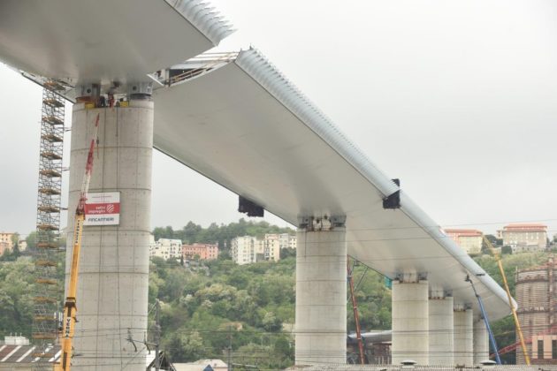 Per completare l’impalcato sono serviti 19 sollevamenti, di cui 3 speciali per le maxi-campate da 100 metri l’una, che ad oltre 40 metri di altezza, hanno scavalcato il torrente Polcevera e la ferrovia. Operazioni che sono durate, nel caso dei sollevamenti speciali, anche 48 ore e che hanno richiesto importanti attività preparatorie con squadre di oltre 50 persone all’opera e l’utilizzo di speciali macchinari come le maxi-gru e gli strand jack, apparecchiature necessarie per issare gli impalcati pesanti sino a 1800 tonnellate.