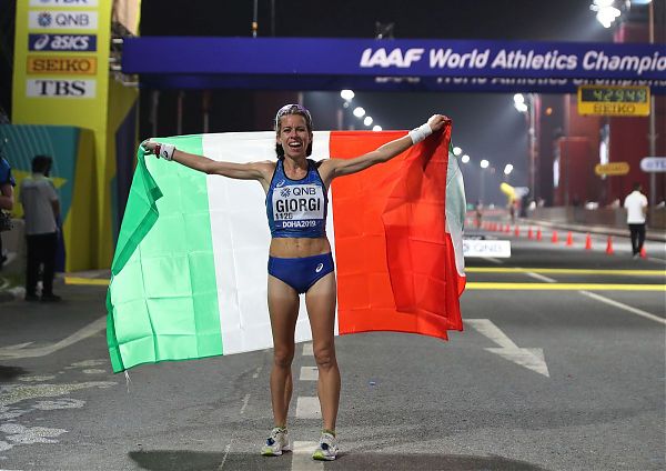 È di bronzo la prima medaglia per l’Italia ai Mondiali di Doha. Arriva dalla 50 chilometri di marcia e a conquistarla è Eleonora Giorgi. L’azzurra è terza nella gara più lunga, svolta nel cuore della notte e in condizioni ambientali difficili per il caldo. Sulle strade della capitale del Qatar, la trentenne lombarda delle Fiamme Azzurre corona il suo sogno al termine di una prova di carattere, in cui riesce a superare alcuni momenti di crisi per mantenere il vantaggio nei confronti delle inseguitrici. Il tempo finale è di 4h29:13, nettamente più alto rispetto al primato europeo di 4h04:50 da lei realizzato a metà maggio, vincendo in Coppa Europa all’esordio sulla distanza. All’arrivo c’è il sorriso sul volto dell’atleta allenata dall’ex cinquantista Gianni Perricelli, due bandiere tricolori in mano e tutta l’emozione per il primo podio in un grande evento internazionale, dopo averlo cercato più volte in passato nella 20 chilometri.