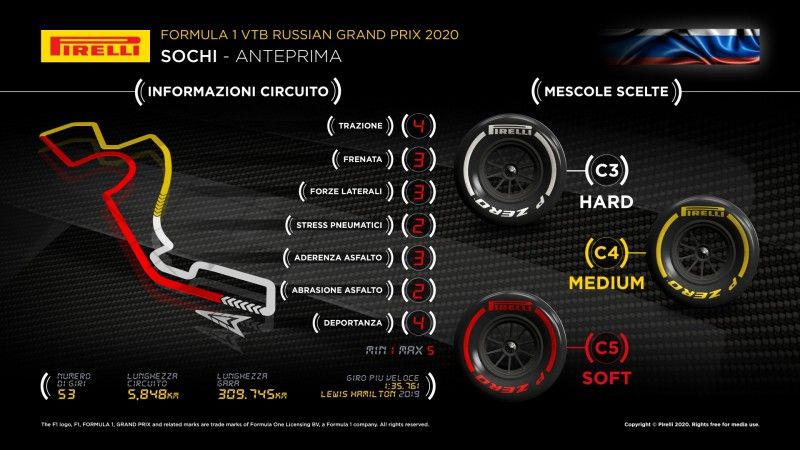 Pirelli, due settimane dopo la gara al Mugello, per la quale sono state nominate le tre mescole più dure della gamma, porta a Sochi le tre più morbide: C3 sarà P Zero White hard, C4 P Zero Yellow medium e C5 P Zero Red soft. Queste tre mescole sono state scelte per affrontare l’asfalto piuttosto liscio del tracciato russo, famoso per essere poco severo sui pneumatici. C3, C4 e C5 rappresentano la nomination ideale per questa gara visto il clima piuttosto mite di Sochi e il fatto che il tracciato non presenti curve particolarmente difficili.