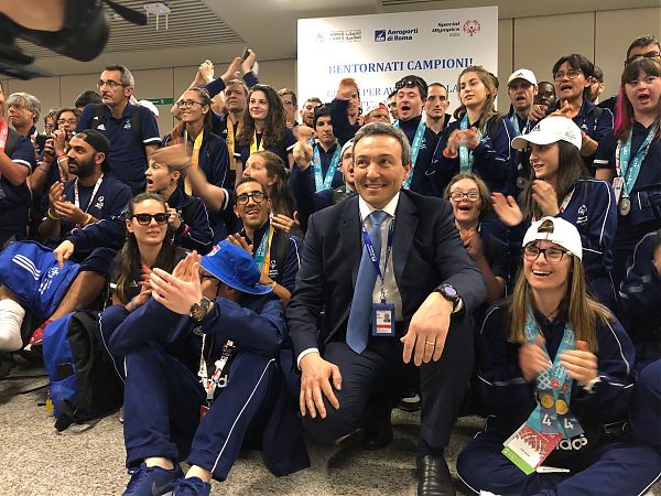 È rientrata accolta all’aeroporto di Fiumicino da un pannello “Bentornati Campioni”, dall’inno Nazionale e dai vertici di Adr il presidente, Antonio Catricalà, e l’amministratore delegato, Ugo De Carolis, la delegazione degli atleti Special Olympics Italia, oltre 150 persone, che hanno partecipato agli ultimi Giochi Mondiali di Abu Dhabi. Una accoglienza da grandi campioni per i tanti medagliati italiani, chiassosi e orgogliosi che hanno ricevuto l’applauso dei passeggeri in attesa dei loro bagagli. “Italia, Italia” “siamo noi siamo i campioni dell’Italia siamo noi” hanno cantato i 115 atleti mentre aspettavano le loro valigie e si rifocillavano nel buffet organizzato da Adr per l’accoglienza. “Una strepitosa accoglienza per una nazionale che merita di avere” ha detto Chiara Stella Vernole, capodelegazione Special Olympics Italia. “I ragazzi hanno vissuto momenti grandiosi – ha raccontato – sono rimasti 15 giorni fuori casa attraverso lo sport. Si sono allenati tanto in questi anni per arrivare fin qui, quindi è giusto che dopo un percorso così lungo, dopo questi giochi mondiali, in terra italiana ricevano questa accoglienza”.