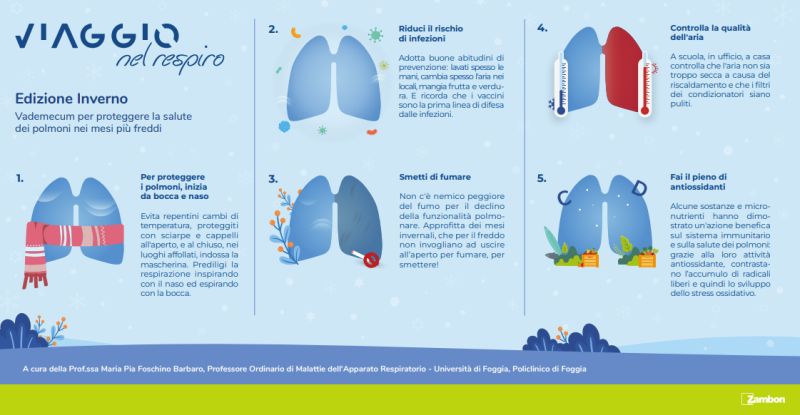 “Le temperature ambientali fredde favoriscono una maggiore trasmissione e sviluppo di infezioni respiratorie a causa di alterazioni della “clearance muco-ciliare”, un importante meccanismo di difesa delle vie respiratorie in grado di contrastare e bloccare l’ingresso nei polmoni di corpi estranei e agenti patogeni come virus e batteri”, spiega Maria Pia Foschino Barbaro, Professore Ordinario di Malattie dell’Apparato Respiratorio – Università di Foggia, Policlinico di Foggia, curatrice del vademecum “Viaggio nel respiro – edizione inverno”, una nuova iniziativa educazionale della campagna “Proteggi i tuoi polmoni”, promossa da Zambon Italia, per spiegare in modo semplice perchè e come prendersi cura della salute delle proprie vie respiratorie, disponibile sul sito www.proteggiituoipolmoni.it.