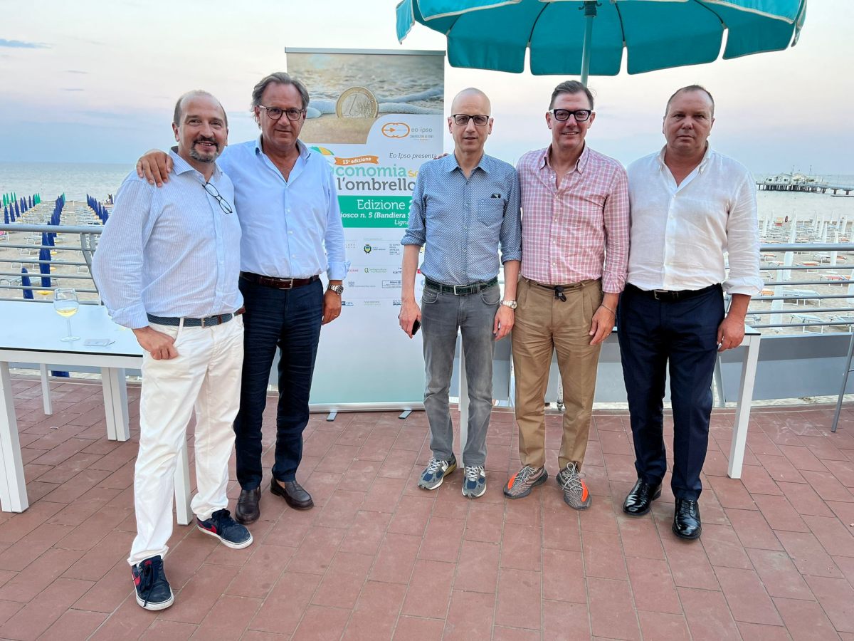 – foto ufficio stampa “Economia sotto l’ombrellone” 2023 (da sinistra: Carlo Tomaso Parmegiani, Mauro Di Bert, Lanfranco Sette, Luca Di Benedetto e Emilio Coradazzo) –