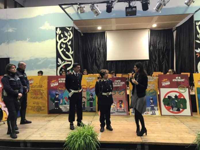 Il Sindaco di Roma, Virginia Raggi, ha visitato l’Istituto Comprensivo Olcese di Tor Tre Teste per presentare il fumetto «Proteggi il tuo cuore», che racconta le norme contenute nel nuovo regolamento di polizia Urbana. Nella scuola del V Municipio, Raggi ha presentato le venti vignette insieme a Veronica Mammì, assessore alla persona, scuola e comunità solidale; Giovanni Boccuzzi, presidente del Municipio; Stefano Napoli, vice comandante della Polizia Locale e Mario De Sclavis, dirigente del V Gruppo della Polizia Locale.