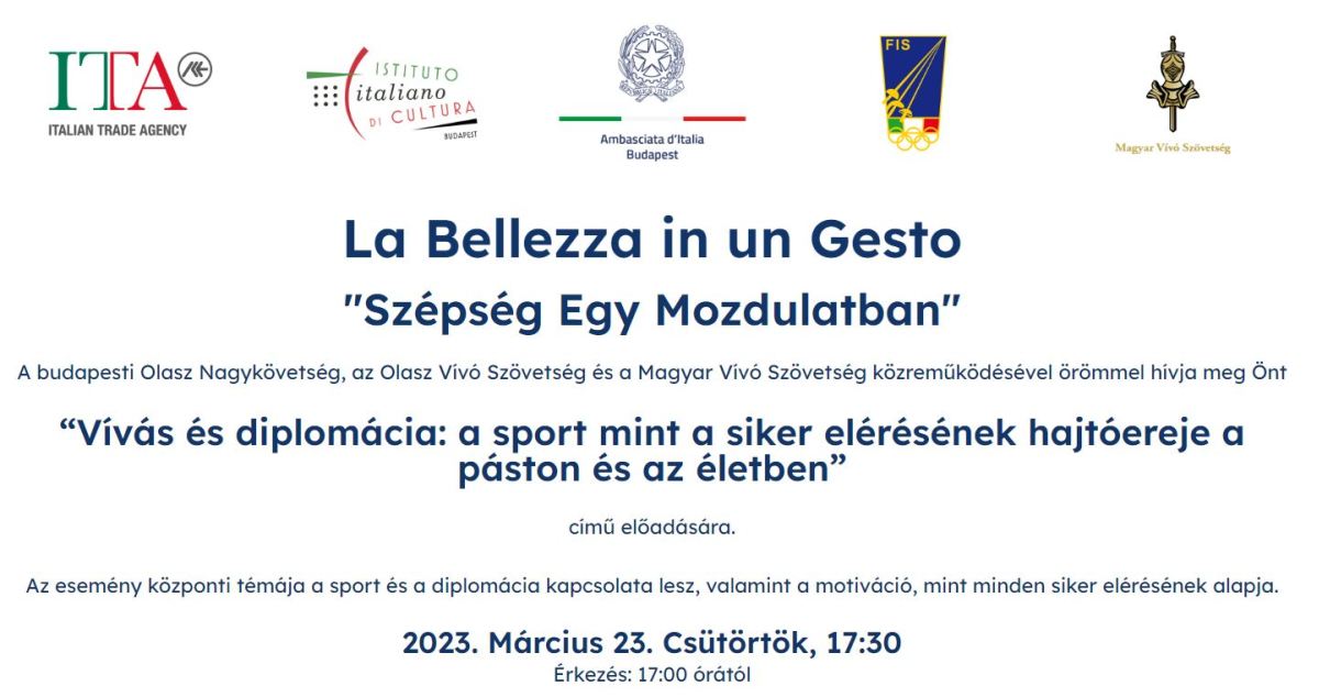 L’incontro sarà aperto dall’ambasciatore d’Italia in Ungheria, Manuel Jacoangeli, e vi prenderà parte anche il presidente della Federazione Italiana Scherma, Paolo Azzi, per raccontare l’impegno della Fis in ambito internazionale nel solco del binomio sport-diplomazia. Con l’appuntamento di domani a Budapest, il progetto “La bellezza in un gesto” tocca la sua undicesima tappa, che segue, a poco meno di undici mesi dall’inizio, gli eventi svoltisi a Madrid, Tunisi, Il Cairo, Algeri, Belgrado, Tokyo, Vancouver, Parigi, Doha e Buenos Aires (in programma oggi). Un percorso intenso e ricco di contenuti per questo programma nato dal Protocollo d’intesa tra il Ministero degli Affari Esteri e della Cooperazione Internazionale e la Federazione Italiana Scherma, a sostegno della promozione integrata dell’immagine dell’Italia nel mondo attraverso lo sport delle tre armi, per il tramite della rete diplomatico-consolare.