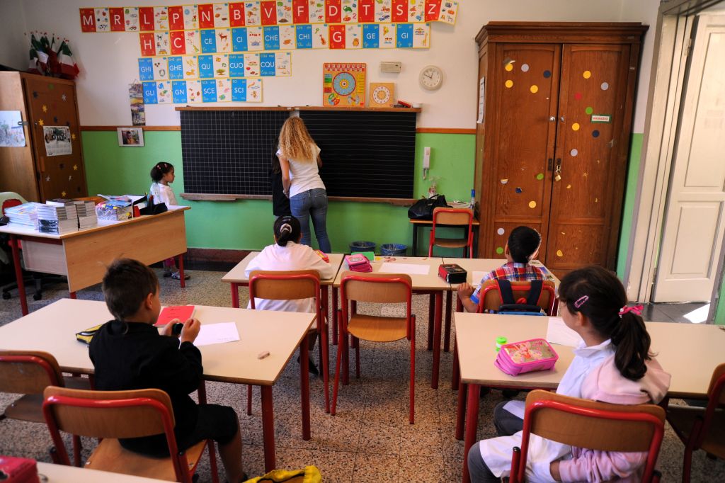 PRIMO GIORNO DI SCUOLA ALLA SCUOLA ELEMENTARE DI VIA DOLCI. ALUNNI IN CLASSE CON INSEGNANTE CHE SCRIVE ALLA LAVAGNA (Milano - 2013-09-12, Maurizio Maule) p.s. la foto e' utilizzabile nel rispetto del contesto in cui e' stata scattata, e senza intento diffamatorio del decoro delle persone rappresentate