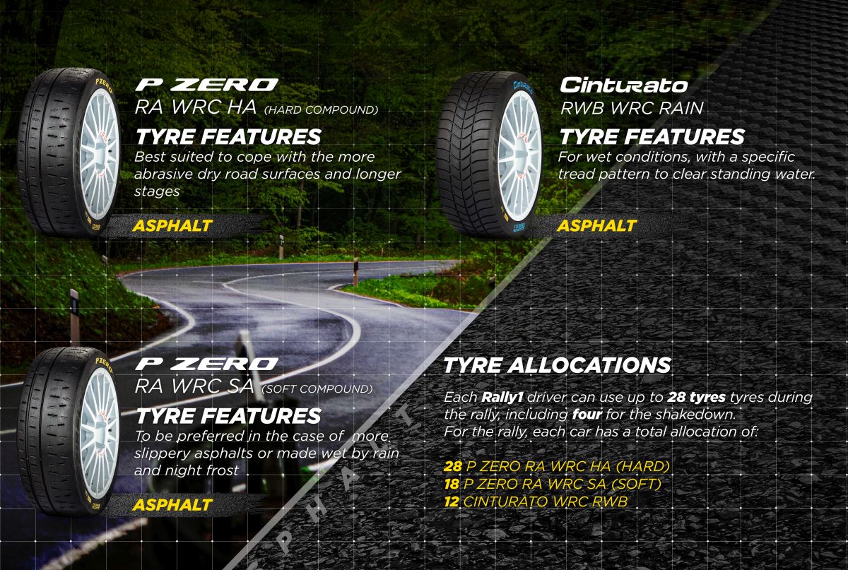 Le insidie dei tracciati intorno alla capitale croata sono numerose, anche se ormai ben note ai piloti. Le principali sono: la variabilità della tipologia dei fondi stradali con differenze anche importanti in termini di grip tra una prova speciale e l’altra; la presenza di tratti con asfalto sconnesso e usurato dagli agenti atmosferici; la natura delle strade che sono veloci ma spesso strette, con possibilità di peggioramento delle superfici passaggio dopo passaggio; la pioggia che può essere tanto intermittente quanto copiosa allo stesso tempo. A disposizione tre tipi di gomme. Il P Zero RA WRC, il pneumatico da rally su asfalto di Pirelli, è disponibile in due mescole. Per la Croazia la prima scelta sarà la versione a mescola dura (P Zero RA WRC HA), la più adatta a fronteggiare i fondi stradali asciutti più abrasivi e le tappe più lunghe, mentre la versione a mescola morbida (P Zero RA WRC SA) sarà la option, da preferire nel caso di asfalti per loro natura più scivolosi o resi umidi dalla pioggia e dalla brina notturna. Il P Zero RA è la linea di prodotto dedicata alle vetture Rally2 e Rally3, utilizzata quindi sia nel WRC2 e nel WRC3, sia nello Junior WRC. I prodotti Rally 2 e Rally 3 sono diversi tra di loro come misure e mescole. Anche in questo caso sono disponibili la versione a mescola dura (RA5A per Rally2 e RA5 per Rally3), che ha debuttato lo scorso autunno nel Rally di Spagna e che in Croazia è la prime, e quella a mescola morbida (RA7+B per Rally2 e RA7+ per Rally3). Gli pneumatici P Zero RA condividono molte delle caratteristiche degli pneumatici WRC montati sulle vetture di prima fascia. Poi c’è il Cinturato RW: tutte le categorie a trazione integrale hanno a disposizione un pneumatico da pioggia adatto agli asfalti bagnati o molto umidi. Il nuovo Cinturato RWB WRC è disponibile per le sole vetture Rally1. Le Rally2 utilizzano la versione RWB, mentre le vetture Rally3 utilizzano la mescola Cinturato RW1C. Il regolamento prevede che ogni vettura Rally1 può montare complessivamente fino a 28 pneumatici durante tutta la gara incluse le 4 per lo shakedown. Le allocazioni sono di 28 gomme per la prime P Zero RA WRC HA, 18 per la option P Zero RA WRC SA e 12 per le Cinturato RWB da bagnato. Le vetture delle categorie WRC2 e WRC3 (dunque anche lo Junior) possono utilizzare fino a 26 pneumatici. L’allocazione in questo caso è di 26 gomme per la prime, 18 per la option, 12 per il bagnato.