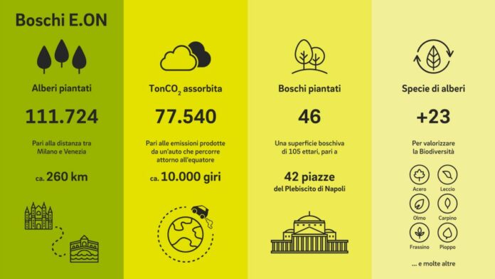 Nell’ambito di questa strategia, uno dei fiori all’occhiello è il progetto Boschi E.ON, che, inaugurato nel 2011, ha contribuito in modo significativo e concreto a rendere l’Italia più verde, grazie alla riforestazione di aree naturali, parchi nazionali e regionali sul territorio italiano. L’iniziativa, che rappresenta uno dei più rilevanti progetti di forestazione portati avanti da un’impresa privata in Italia, ha consentito ad oggi la piantagione di oltre 110.000 alberi, per un totale di 46 boschi, con una superficie di 105 ettari, pari a 105 campi da calcio regolamentari oppure – se gli alberi fossero disposti uno di fianco all’altro – alla distanza lineare tra Milano e Venezia.