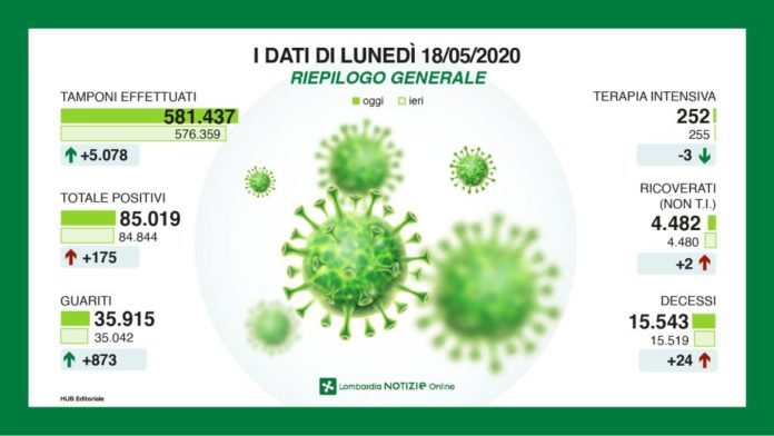 In Lombardia 175 nuovi casi Covid, 873 i guariti e 24 morti