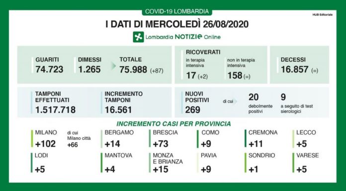 MILANO (ITALPRESS) – In Lombardia, per il secondo giorno consecutivo, non si registra alcun decesso e sono 87 i nuovi guariti e dimessi. A fronte dell’alto numero di tamponi effettuati, pari a 16.561, sono 269 i nuovi positivi riscontrati, con un rapporto tra tamponi e numero di positivi pari a 1,6%. Lo riferisce il quotidiano bollettino regionale sui dati epidemiologici diffuso da Palazzo Lombardia. Si registra un lieve aumento nei ricoverati in terapia intensiva (+2) su un totale di 17 mentre restano stabili i ricoverati negli altri reparti, per un numero complessivo di 158 a livello regionale.