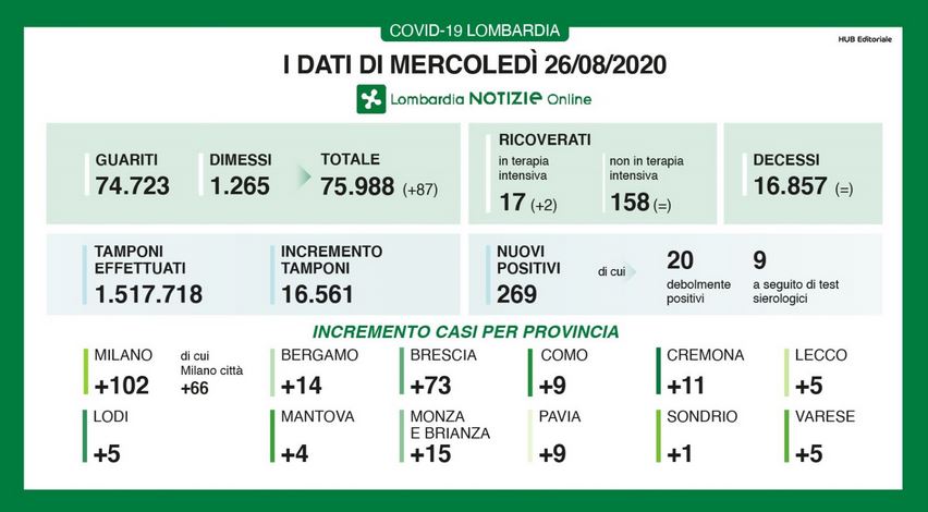 “I dati di oggi- spiega l’assessore al Welfare della Regione Lombardia – si caratterizzano per l’elevato numero di tamponi effettuati, 16.561, dai quali sono scaturite 269 positività. Circa 2/3 di queste sono determinate da rientri in Lombardia dall’estero. Ben 214 dei casi positivi odierni sono riferiti a persone con età inferiore a 50 anni, 28 di questi sono minorenni”.