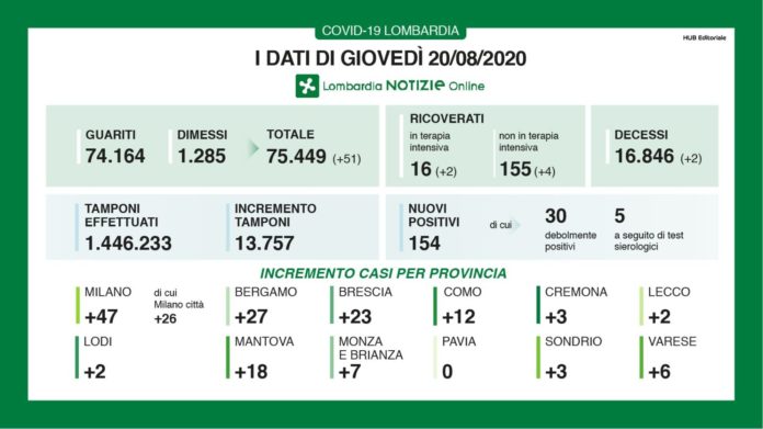 MILANO (ITALPRESS) – Continuano ad aumentare i contagi da Coronavirus in Lombardia. Nelle ultime 24 ore sono infatti 154 (di cui 30 debolmente postivi e 5 a seguito di test sierologico), contro i 91 della giornata precedente. A rivelarlo sono i dati diffusi oggi dal consueto bollettino di Regione Lombardia. Aumentano i tamponi effettuati (13.757) contro i 9.000 di ieri, ma anche i guariti e dimessi (+51). In totale sono 155 i positivi ricoverati nelle strutture ospedaliere lombarde (+5 rispetto a ieri), dei quali 16 in terapia intensiva (+2). Due i decessi nelle ultime 24 ore. A livello provinciale spiccano i zero contagi a Pavia, mentre l’area più colpita è Milano (47, 26 dei quali nel capoluogo). 27 casi a Bergamo, 23 a Brescia, 12 a Como, 3 a Cremona, 2 a Lecco e a Lodi, 18 a Mantova, 7 nella provincia di Monza e Brianza, 3 a Sondrio e 6 a Varese.