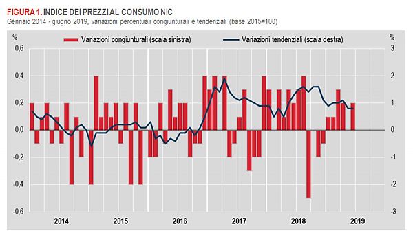 L’inflazione decelera per i beni (da +0,8% a +0,6%), mentre accelera per i servizi (da +0,8% a +1,0%); pertanto, rispetto al mese di maggio il differenziale inflazionistico è positivo e pari a +0,4 (era zero nel mese precedente). L’inflazione acquisita per il 2019 è +0,7% per l’indice generale e +0,5% per la componente di fondo. Per i Beni alimentari, per la cura della casa e della persona l’inflazione rimane stabile a +0,3%, mentre per i prodotti ad alta frequenza d’acquisto la crescita dei prezzi rallenta da +1,0% a +0,6%, portandosi anch’essa al di sotto di quella riferita all’intero paniere. Secondo le stime preliminari, l’indice armonizzato dei prezzi al consumo (IPCA) aumenta dello 0,1% su base mensile e dello 0,8% in termini tendenziali (in lieve rallentamento da +0,9% del mese precedente).