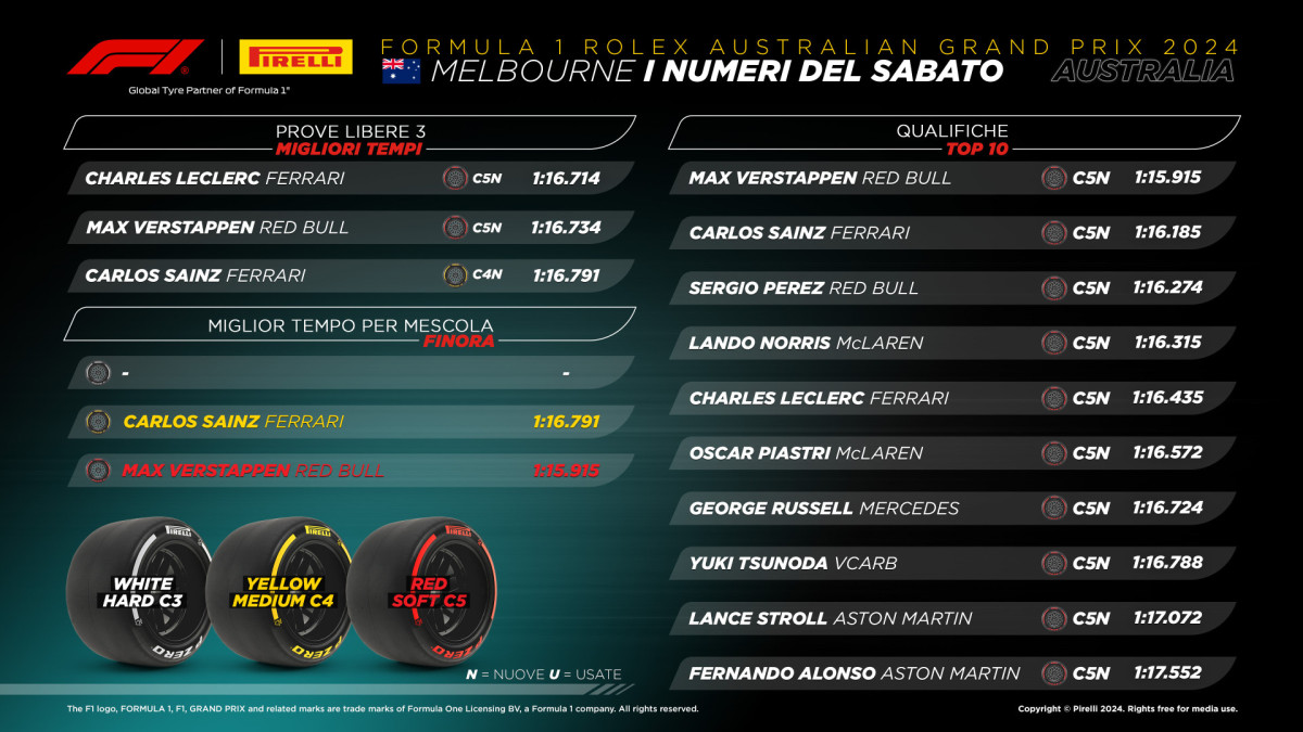 MELBOURNE (AUSTRALIA) (ITALPRESS) – Prosegue l’imbattibilità di Max Verstappen (Red Bull) in qualifica in questo inizio di stagione con la terza pole position consecutiva, la quarta se consideriamo anche l’ultima gara del 2023 (Abu Dhabi). Per il pilota olandese questa è la trentacinquesima pole della carriera, la seconda di seguito a Melbourne. La terza sessione di prove libere ha confermato le indicazioni emerse ieri in merito all’utilizzo delle gomme in gara. Infatti, la Hard non è stata praticamente mai usata, visto che soltanto i piloti di Aston Martin, McLaren e Kick F1 hanno effettuato un giro di rodaggio con la C3 (due set rodati da Aston Martin e McLaren, uno da Kick F1). Ciò significa che questa sarà la mescola più utilizzata domani, al netto delle scelte che saranno effettuate dalle squadre per quanto riguarda i set da restituire stasera. In qualifica, la mappa dell’utilizzo dei pneumatici segna il rosso fisso: tutti e 19 i piloti in lizza – Logan Sargeant (Williams) non ha potuto partecipare sin dalle prove libere per la mancanza di un telaio di scorta – hanno usato la C5. Da notare che il tempo della pole position è stato più veloce di oltre quattro decimi rispetto alle simulazioni della vigilia (1’16″350) e di più di sette rispetto alla pole position dello scorso anno (1’16″732), ottenuto peraltro con la mescola C4, nel 2023 selezionata come Soft.