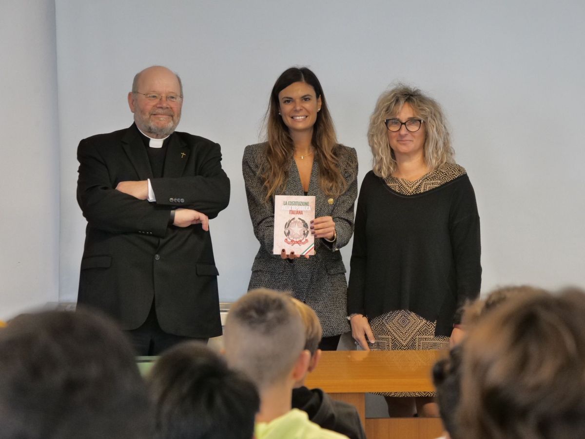 VENEZIA (ITALPRESS) – La presidente del Consiglio comunale di Venezia, Ermelinda Damiano, si è recata questa mattina alla scuola Santa Caterina della Fondazione Groggia di Mestre, in via Tassini 17, dove ha consegnato agli studenti di III media, IV e V liceo copie della Costituzione italiana. “Mi auguro che questo opuscolo sia parte del vostro bagaglio di studio ma soprattutto di vita – ha detto la presidente Damiano rivolgendosi ai ragazzi – e come Amministrazione comunale siamo orgogliosi che la vostra scuola, con il nostro aiuto, vi offra questi strumenti di crescita e conoscenza, perché possiate diventare cittadini consapevoli e partecipi”. Presenti il presidente e la coordinatrice delle attività didattiche ed educative della Fondazione Groggia, rispettivamente don Dino Pistolato e Laura Visentin.