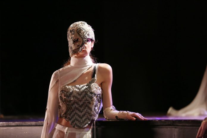 La musica live, antica nostalgia di un pianoforte e di un violino, volutamente giocata tra note e colori malinconici contrapposti a timbri più contemporanei, come punto di partenza per riaccendere le luci del palcoscenico, la danza come mezzo narrativo per raccontare una collezione pensata nel rispetto dell’ambiente e di un’economia circolare che recupera materiali di scarto come organze e cerniere lampo per riportarle a nuova vita. Abiti che seducono con volute trasparenze per svelare la sinuosità dei corpi in movimento, che costruiscono con zip difettate corpetti come corsetti medioevali, come sensuali bustier, come giurassiche spine dorsali, come intarsi ed intrecci, che svelano e nascondono continue metamorfosi dietro enormi maniche, mantelli, stravaganti cornici di legno indossate come giacche, oppure preziosi boleri ricamati a ramage.
