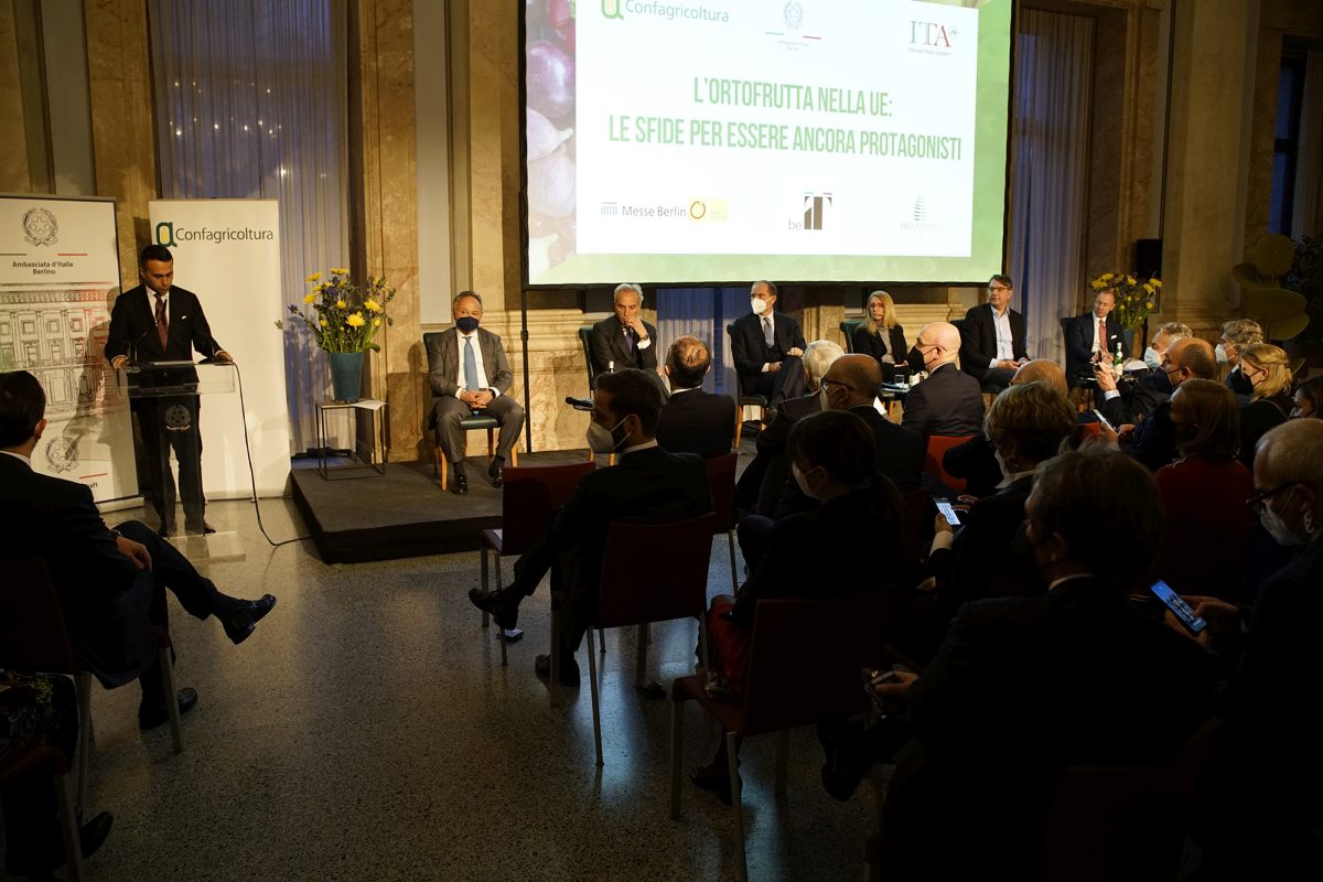 In occasione dell’inaugurazione della Fiera, ospitati dall’Ambasciatore, Armando Varricchio nella sede dell’ambasciata italiana, alla presenza del ministro degli Esteri Luigi Di Maio, si è discusso dell’incerto quadro internazionale economico e di mercato in cui i nostri imprenditori si trovano ad operare. Nella tavola rotonda, organizzata da Confagricoltura insieme ai partner Fruitimprese, ICE Agenzia e la rappresentanza italiana di Messe Berlin/Fiera di Berlino, si è discusso della difficile fase congiunturale, in vista di una revisione della recente Riforma dalla Politica agricola comunitaria.
