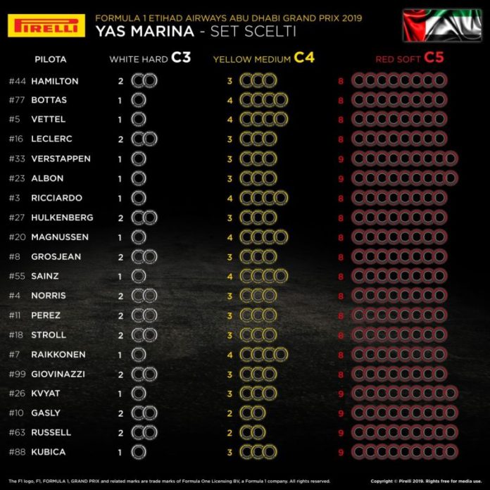 La FIA ha comunicato a Pirelli il numero di set di pneumatici e mescole scelti da ciascun pilota per il Gran Premio di Abu Dhabi (29 novembre/1 dicembre).