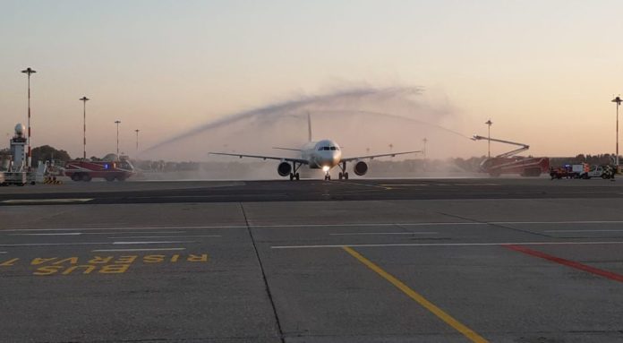 È atterrato puntuale alle 18.00 il volo Alitalia AZ2092, proveniente da Roma Fiumicino, che ha inaugurato questo pomeriggio la nuova pista dell’aeroporto milanese di Linate, rimasto chiuso per tre mesi a causa dei lavori di restyling cominciati il 27 luglio e che hanno interessato, oltre alla pista, interamente rifatta, anche il sistema di smistamento dei bagagli e un’area del terminal. A bordo dell’aereo, 64 passeggeri. Una volta atterrato, prima di attaccarsi al finger del terminal, l’AirBus 320 è stato ‘battezzato’ passando sotto un arco d’acqua creato da due autopompe dei vigili del fuoco. Il volo da Roma inaugura gli arrivi del rinnovato scalo milanese, mentre le partenze cominceranno da domani, con il volo Lufthansa delle 6.30 per Francoforte. All’interno del terminal, ad accogliere i passeggeri, erano presenti il ministro per le Infrastrutture e i Trasporti, Paola De Micheli, il sindaco di Milano, Giuseppe Sala, e Armando Brunini e Michaela Castelli, rispettivamente amministratore delegato e presidente di Sea, la società che gestisce gli aeroporti milanesi.