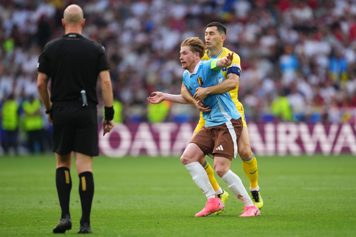 Kevin De Bruyne of Belgium and Taras Stepanenko of Ukraine during the UEFA Euro 2024 match between Ukraine and Belgium, Group E, date 3, played at Mercedes-Benz Arena Stadium on June 26, 2024 in Stuttgart, Germany. (Photo by Bagu Blanco / Sipa USA)