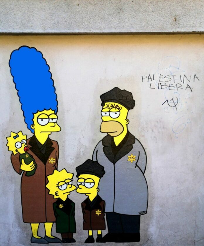 MILANO (ITALPRESS) – Una grande scritta “Palestina Libera” con il simbolo della falce e martello è visibile sui muri del Memoriale della Shoah sul secondo murales “Binario 21, I Simpson deportati ad Auschwitz” dell’artista Alexsandro Palombo. E’ la quinta volta che le opere dedicate alla memoria dell’Olocausto vengono prese di mira e in questo caso per diventare strumento di protesta con slogan pro Gaza. L’opera di Palombo che ritrae la famiglia Simpson in veste di ebrei deportati ai campi di sterminio era stata realizzata nel Gennaio del 2023 in occasione della Giornata della memoria e ieri sera al Memoriale della Shoah si è tenuta la cerimonia di commemorazione dell’80° anniversario dalla deportazione degli ebrei di Milano.(ITALPRESS).