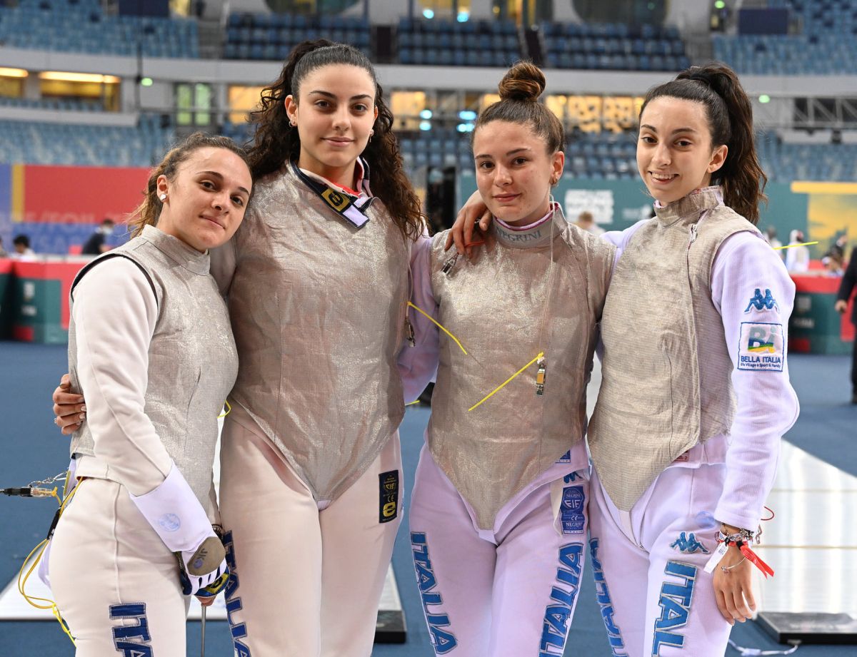 Nella prova femminile Giulia Amore (Fiamme Oro/Club Scherma Roma), Irene Bertini (Carabinieri/Pisascherma), Carlotta Ferrari (Comense Scherma) e Benedetta Pantanetti (Club Scherma Ancona) si sono invece aggiudicate una bellissima medaglia d’argento. Le ragazze, seguite a fondo pedana dal CT Stefano Cerioni e dalla maestra Francesca Bortolozzi, hanno vinto il primo incontro di giornata 45-36 contro la Gran Bretagna e ai 16 hanno avuto la meglio sulla Romania per 45-31 in un assalto equilibrato fino alla metà e in cui poi hanno preso il largo. Netto il match contro la Spagna ai quarti, dominato dal quartetto italiano come dimostra il 45-14 finale e lo stesso è stato anche il copione della semifinale, dove l’Ucraina è stata superata per 45-24. In finale è arrivata la sconfitta 45-33 contro gli Stati Uniti, che non ha comunque offuscato l’ottima prestazione delle azzurrine e ha permesso loro di laurearsi vice campionesse mondiali.