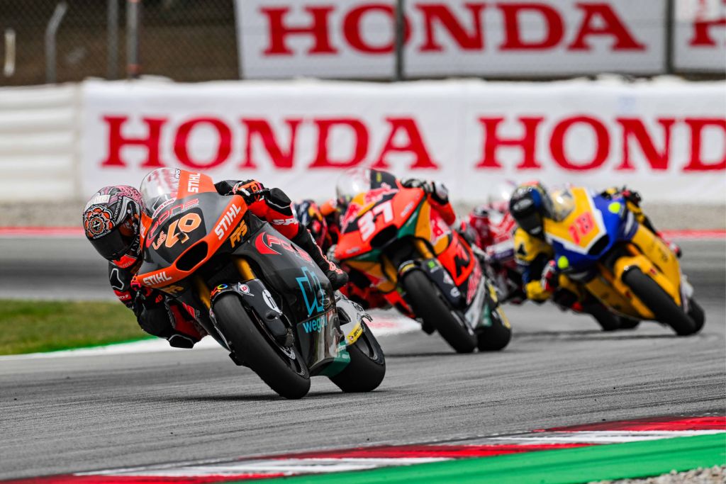 Aron Canet (40) of Spain and Pons Wegow Los40 , Pedro Acosta (37) of Spain and Red Bull KTM Ajo and Manuel Gonzalez (18) of Spain and Correos Prepago Yamaha VR46 Team during the MOTO 2 RACE of the Catalunya Grand Prix at Montmelo racetrack, Spain on September 03, 2023 (Photo: Alvaro Sanchez) Cordon Press
