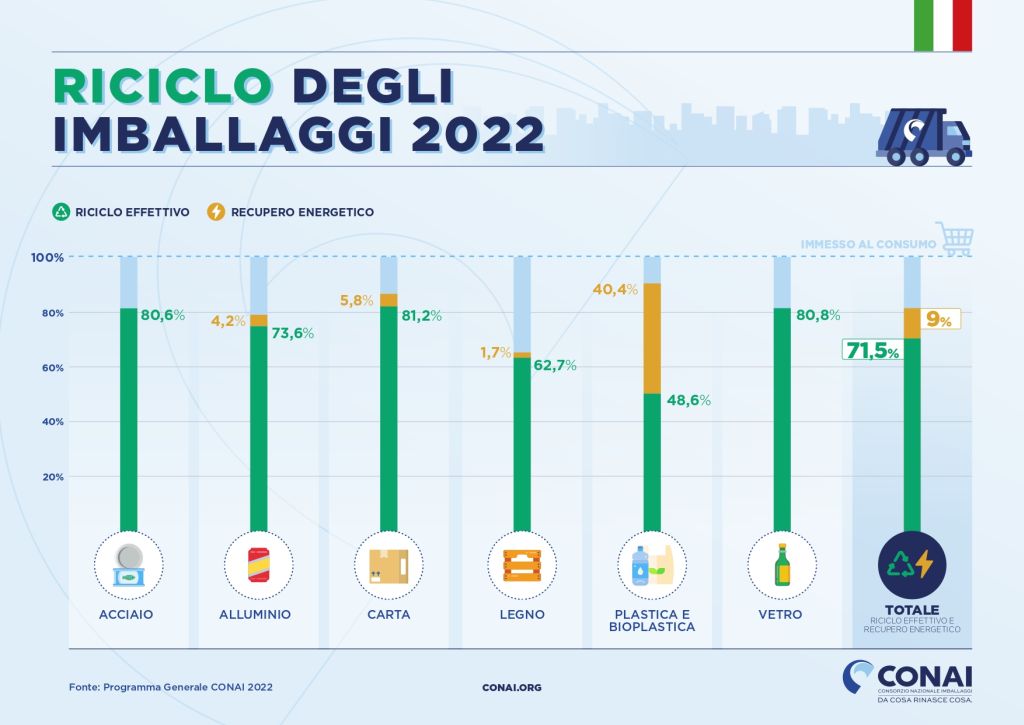 MILANO (ITALPRESS) – Nel 2022 il 71,5% dei rifiuti di imballaggio in Italia è stato riciclato. Su 14 milioni e mezzo di tonnellate di imballaggi immessi al consumo, 10 milioni e 400mila hanno trovato una seconda vita.