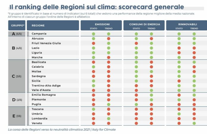 La classifica, elaborata in base a tre parametri chiave, emissioni di gas serra, consumi di energia e fonti rinnovabili (prendendo in considerazione i più recenti dati consolidati e ufficiali, quelli del 2019, e analizzando i trend di miglioramento conseguite nel biennio precedente), evidenzia che metà delle Regioni italiane non ha ridotto le proprie emissioni di gas serra.