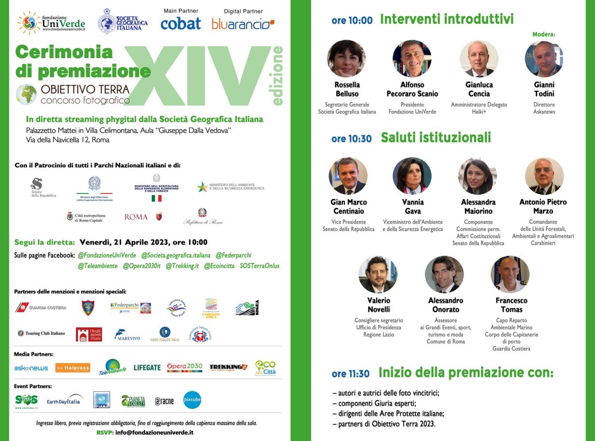 Insieme ai rappresentanti dei soggetti promotori, Alfonso Pecoraro Scanio (Presidente della Fondazione UniVerde) e Rossella Belluso (Segretario Generale della Società Geografica Italiana), la cerimonia di premiazione sarà introdotta anche da Gianluca Cencia (Amministratore Delegato di Haiki+, la sub-holding del Gruppo Innovatec dedicata all’economia circolare, di cui Cobat fa parte da fine 2021). Interverranno: Gian Marco Centinaio (Vice Presidente del Senato della Repubblica); Vannia Gava (Viceministro dell’ambiente e della sicurezza energetica); Alessandra Maiorino (Componente della Commissione permanente Affari Costituzionali, Senato della Repubblica); Gen. C.d’A. Antonio Pietro Marzo (Comandante Unità forestali, Ambientali e Agroalimentari dei Carabinieri); Valerio Novelli (Consigliere segretario dell’Ufficio di Presidenza, Regione Lazio); Alessandro Onorato (Assessore ai grandi eventi, sport, turismo e moda, Comune di Roma); Capitano di Vascello, Francesco Tomas (Capo Reparto Ambientale Marino, Corpo delle Capitanerie di porto – Guardia Costiera); con la partecipazione di autori e autrici delle foto vincitrici, componenti della Giuria di esperti, dirigenti delle Aree protette italiane e partners di Obiettivo Terra 2023.