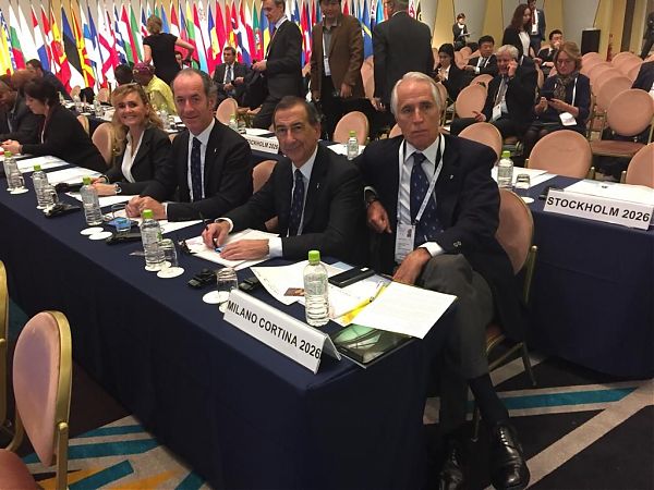 “E’ una candidatura che ha il pieno sostegno degli atleti e dei tecnici – ha sottolineato Malagò -, qui rappresentati dalla plurimedagliata olimpica di Short Track, Arianna Fontana, portabandiera dell’Italia a PyeongChang 2018, che viene dalla Lombardia. E’ una candidatura che include altri due medagliati olimpici: Diana Bianchedi, due volte campionessa olimpica e una dei leader del progetto, e Carlo Mornati, segretario generale del Coni, e dai membri italiani del Cio, qui rappresentati da Mario Pescante e Ivo Ferriani. Ovviamente il Comitato Nazionale Olimpico è totalmente impegnato con le sue forze e le sue energie a sostenere Milano-Cortina, così come è impegnato il Governo italiano che garantirà alla candidatura il supporto per i servizi di sua competenza. Noi crediamo che la chiave vincente del nostro progetto sia la parola INSIEME. Insieme perché uniamo il pubblico col privato, la tradizione con l’innovazione, l’efficienza di una grande metropoli col fascino incantevole della montagna. E’ un grande gioco di squadra con un unico obiettivo: riportare i Giochi Olimpici in Italia. La nostra è una sfida avvincente. E’ il sistema organizzativo dell’Italia che scende in campo. Sono le eccellenze del nostro Paese che sono pronte a investire e a schierarsi al nostro fianco per far sì che questo sogno possa diventare realtà”.