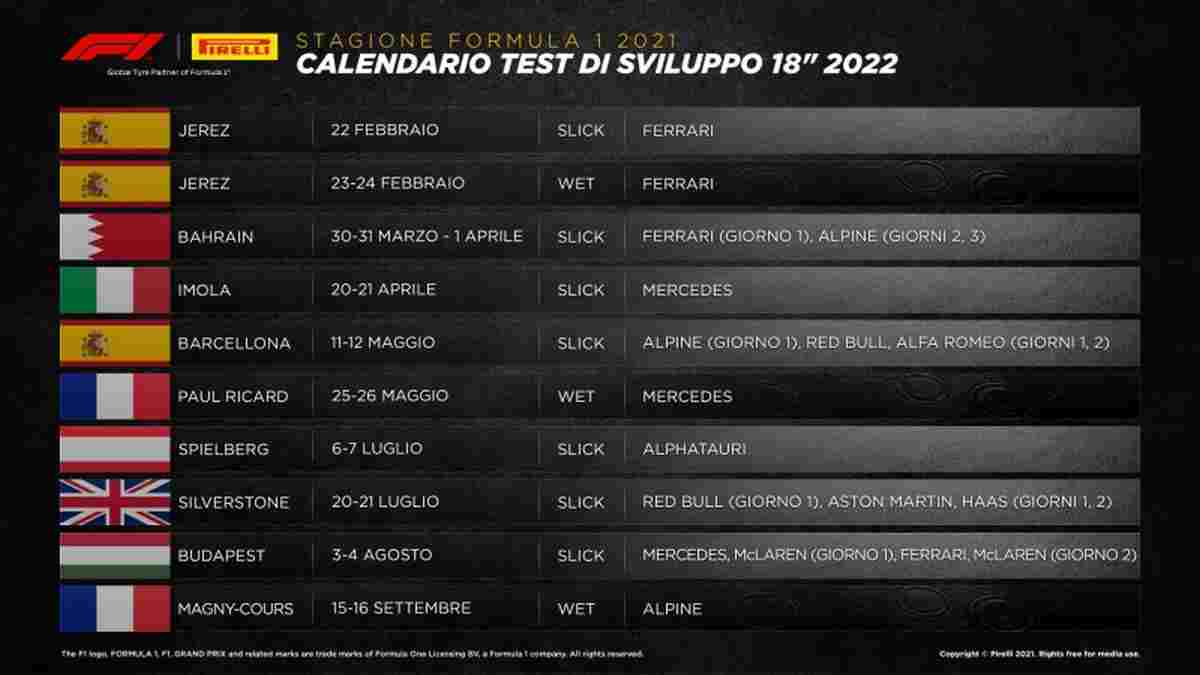 Nel 2021, i test da 18 pollici prevedono l’utilizzo di pneumatici sia slick (sette sessioni) sia wet (tre sessioni) con quattro sessioni standalone e sei che si svolgeranno immediatamente dopo un weekend di gara. Le prime due sessioni hanno già avuto luogo a Jerez, in Spagna, con la Ferrari dal 22 al 24 febbraio: sono stati testati sia pneumatici slick che da bagnato. Quest’anno, in totale, le sessioni di test si sviluppano su 20 giorni-macchina ma, considerato che più di un costruttore sarà coinvolto in alcune sessioni, di fatto saranno 28 i giorni-macchina complessivi (22 su asciutto e 6 su bagnato).