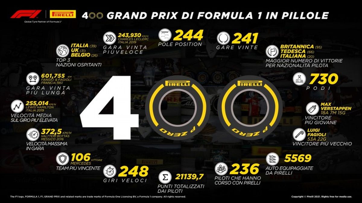 “In Pirelli siamo molto orgogliosi della nostra storia, quindi poter celebrare i 400 Gran Premi è per noi fonte di grande soddisfazione – spiega Mario Isola, responsabile F1 e Car Racing Pirelli -. Arriviamo a questo traguardo proprio a cavallo di una nuova era, ovvero all’inizio dell’ultima stagione di Formula 1 con pneumatici da 13 pollici prima del passaggio a quelli da 18 pollici e a nuove regole tecniche di ampio respiro a partire dal prossimo anno. Mentre ripercorriamo il nostro passato, siamo quindi entusiasti di scrivere anche il prossimo capitolo della nostra storia”.