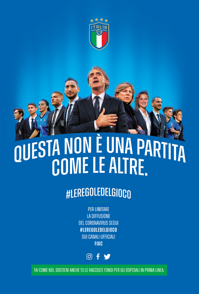 Prende il via oggi la campagna di comunicazione #leregoledelgioco, promossa dalla Federazione Italiana Giuoco Calcio che attraverso gli Azzurri e le Azzurre vuole contribuire a sensibilizzare i cittadini sulle regole da seguire per contenere la diffusione del Covid-19. In un momento particolarmente difficile per il Paese, i calciatori e le calciatrici delle Nazionali vogliono sostenere i comportamenti positivi indicati dalle istituzioni. La campagna #leregoledelgioco, promossa oggi sulle testate sportive, si svilupperà sui canali ufficiali della Figc e delle Nazionali italiane maschile e femminile: una social activation in cui molti protagonisti Azzurri scenderanno in campo per affrontare una partita diversa dalle altre, attraverso 11 regole del gioco. Ciascun protagonista della campagna realizzerà una storia e un breve video in cui racconterà la propria regola e inviterà il pubblico a condividere il messaggio e ad interagire con l’hashtag ufficiale della campagna. Si parte oggi con l’intervento del ct Roberto Mancini: “Regola #1. Il nuovo schema della Nazionale è 1-1-1: per combattere la diffusione del Coronavirus manteniamo almeno un metro di distanza l’uno dall’altro”. Hanno aderito alla campagna della Figc i commissari tecnici Milena Bertolini e Roberto Mancini e saranno coinvolti tanti calciatori e calciatrici: i primi a scendere in campo saranno Leonardo Bonucci, Federico Chiesa, Gianluigi Donnarumma, Alia Guagni, Manuela Giugliano, Cristiana Girelli, Ciro Immobile, Jorginho, Nicolò Zaniolo. Seguiranno nei prossimi giorni altri Azzurri e Azzurre che stanno aderendo al progetto. Ai Capitani Giorgio Chiellini e Sara Gama sarà affidata poi la conclusione della campagna. La campagna, inoltre, ha l’obiettivo di sostenere le strutture sanitarie in prima linea in questa emergenza invitando tutti gli italiani a devolvere; al riguardo, la Figc ha deciso di donare un contributo di 100.000 euro all’Istituto Nazionale per le malattie infettive ‘Lazzaro Spallanzani’ di Roma. “Grazie al coinvolgimento delle Azzurre e degli Azzurri – dichiara il presidente federale Gabriele Gravina – la Figc intende dare il proprio contributo nel promuovere comportamenti responsabili, sostenere moralmente il personale sanitario che sta fronteggiando questa emergenza, con grande professionalità e disponibilità, e supportare economicamente le strutture ospedaliere. Il calcio può fare molto anche quando non scende in campo, con #leregoledelgioco invitiamo tutti gli italiani a giocare e a vincere insieme la partita contro il Coronavirus”. Queste le 11 regole del gioco degli Azzurri e delle Azzurre. Regola #1. il nuovo schema della nazionale è 1-1-1: per combattere la diffusione del Coronavirus manteniamo almeno un metro di distanza l’uno dall’altro. Regola #2. Gioca solamente in casa: Prova a utilizzare questo tempo per scoprire il piacere di stare in casa. Regola #3. Tratta le tue mani con i guanti: Per combattere la diffusione del Coronavirus ricorda di lavare bene le mani con regolarità. Regola #4. Difendi anche l’altra porta: Anziani, famiglie, vicini. In questo periodo aiutiamoci a vicenda. Regola #5. Evita le mischie in area: Per limitare la diffusione del Coronavirus dobbiamo evitare assembramenti soprattutto in luoghi chiusi. Regola #6. Migliora nel fraseggio: Per limitare la diffusione del Coronavirus dobbiamo convincere tutti ad essere più responsabili. Regola #7. Non farti prendere in contropiede: Sul Coronavirus circolano tante fake news. Verifica sempre la provenienza delle notizie. Regola #8. Limita le fughe sulla fascia: Per limitare la diffusione del Coronavirus dobbiamo limitare gli spostamenti. Regola #9. Sfrutta tutti gli spazi: Anche se restiamo in casa dobbiamo sempre cercare di fare attività motoria. Regola #10. Punta tutto sulla fantasia: Per trascorrere al meglio questo periodo di quarantena, non dobbiamo mai perdere il buonumore. Regola #11. Fai di tutto per far vincere la squadra: Per limitare la diffusione del Coronavirus dobbiamo tenere duro e tifare l’uno per l’altro.