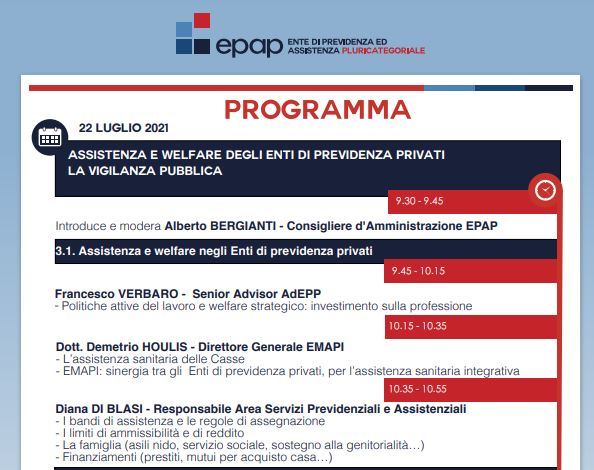 ROMA (ITALPRESS) – “Assistenza e welfare degli enti di previdenza privati, la vigilanza pubblica” è stato il tema al centro del terzo incontro del “Progetto di formazione per la diffusione della cultura previdenziale”, il corso sulle politiche attive organizzato dall’Epap, ente di previdenza e assistenza pluricategoriale. “Il tema di oggi è l’assistenza e il Welfare”, ha spiegato Alberto Bergianti, Consigliere d’amministrazione Epap.